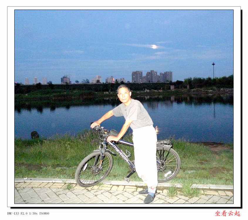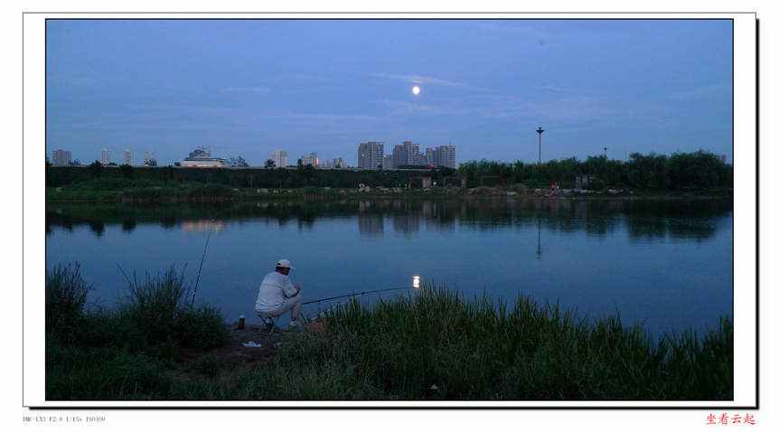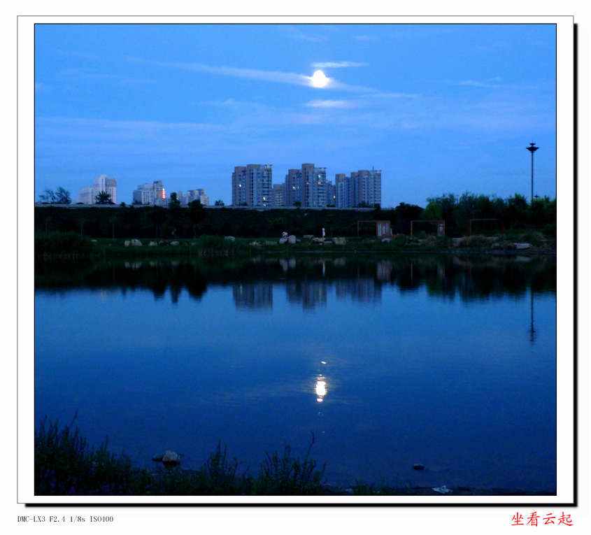 跑到这里来,本意是想拍些晚霞夕照的照片。但是,非常不巧,今天没有形成晚霞。由于出来晚了些,西北方向的云已经早早的退去,衬托着东南方向的一轮明月反而十分明亮。一想,今天是农历六月十四,又到月圆之日。连日阴雨之后,在八一得逢圆月明,实在难得。心有所思,就本着八一明月这个意境,在湖边顺手拍了几张。