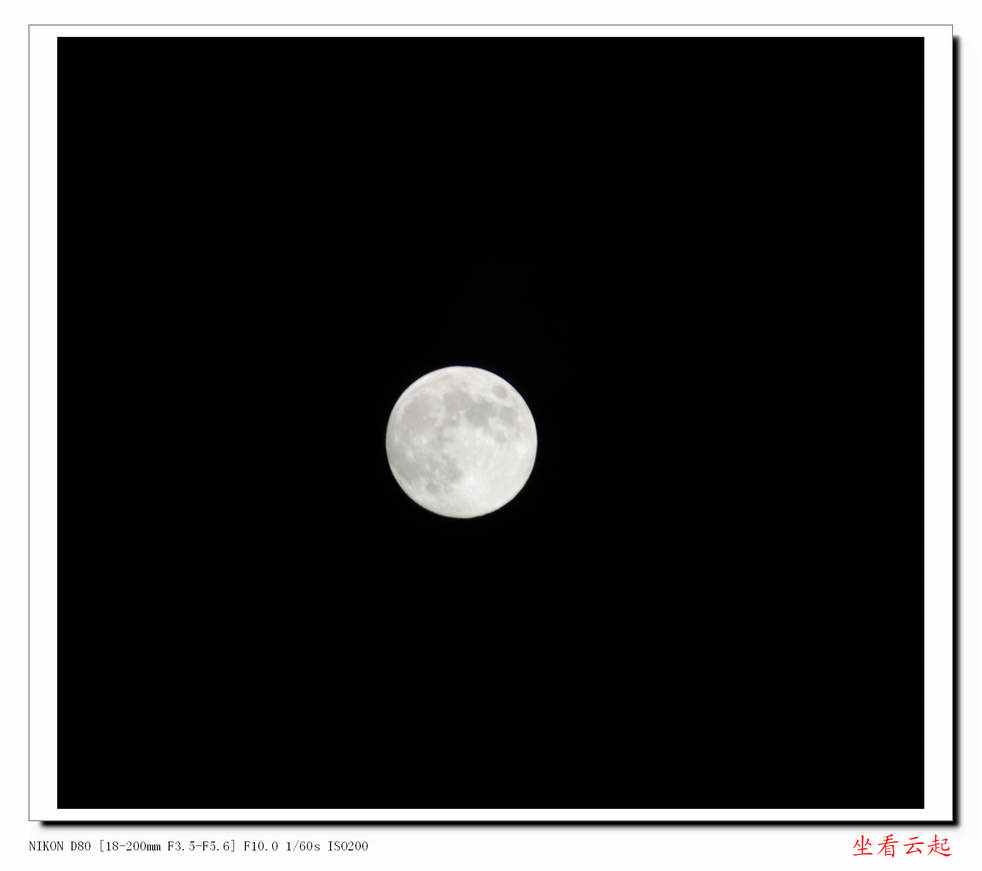 回到家,洗过澡,在阳台上看到明月已经升到半空,又用单反拍了张明月的特写。人们常说,十五的月亮十六明,我觉得今天的月亮就特别的明。这与久雨初晴人们的心情有关,也与连日阴雨天晴后的透视度提高有关。
