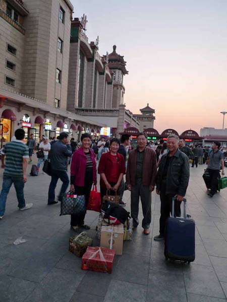 吃了午饭,马上取出行李登上去北京的火车。1点53分离开承德,一路畅谈,傍晚时分6点30分到达北京站。出的站来,为他们四位照了张告别合影。老沈阳夫妇就在那里等车,我与黄圣才夫妇过马路去找到西客站的公交车。到那边的9路车比较少,等了20多分钟才好不容易挤上一班车。北京那叫大城市,堵车已经习以为常,到达西客站时已经是19点45分。我只能就此与黄圣才夫妇告别,让他们自己去找住宿的地方了。因为北京西到石家庄的最后一班动车是20点19分开车。我只有半个小时的时间---一溜小跑进站--过天桥--下楼找到售票处买到一张到石家庄的车票---上楼买上一大瓶农夫山泉矿泉水、一带面包---赶到候车室正好开始检票。8点19分准时开车,到石家庄火车站已经22点38分。穿过车站广场,找到1路车站随即上了1路车。--23点正回到家。