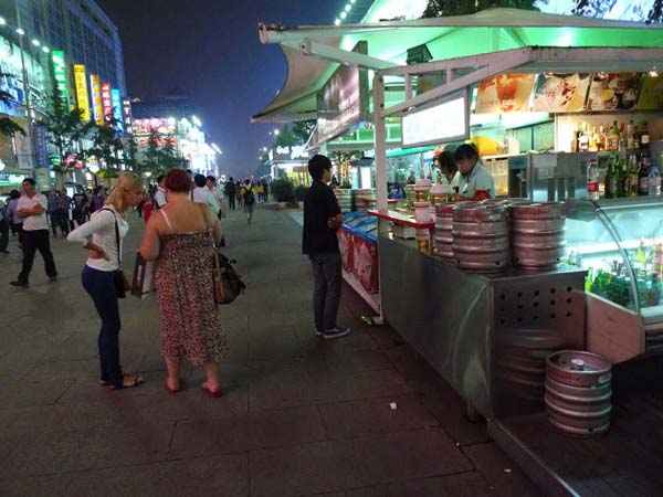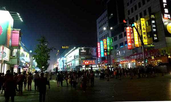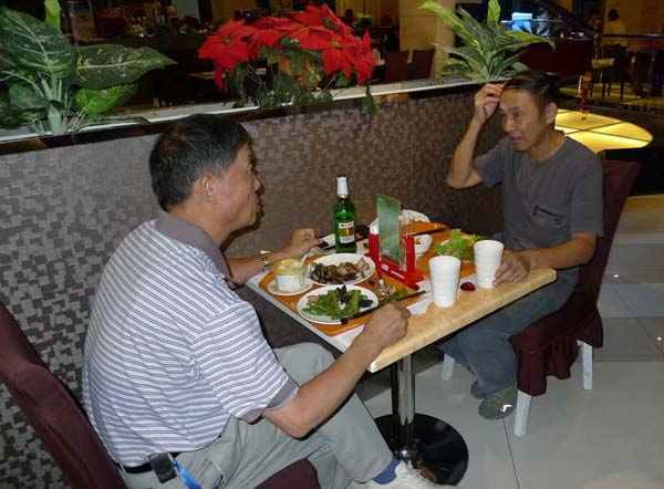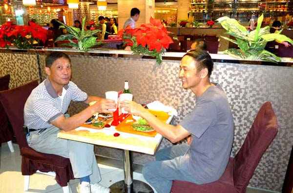 9月11日,送小孩上学回到住处才8点。为了打发闲暇时间,我先是按照网站通讯录找到大河的电话,想与他见面叙一叙,但是他的电话已经关机。发了个短信,也没有回音。这次老沈阳来,才知道他已经回武义,擦肩而过,很是遗憾。联系不上大河,就打电话找到小丁。他正在准备装修房子,也挺忙。但是他见我这次来京有空,就安排在当天晚上在一起聊聊。他在王府井的澳门中心安排吃大饱口福的自助餐,时间定的是晚上6点。我把外孙女接到家,备好晚饭,已经是5点半了。从我所住的西单商场到王府井,大约5公里左右,半个小时的时间赶过去,只有坐地铁,试试运气吧。我5点半下楼,从灵境胡同坐4号线,到西单转1号线,到达王府井大约是5点53分,6点过5分就走到澳门中心。老战友见面,都非常高兴。吃在其次,以聊为主。