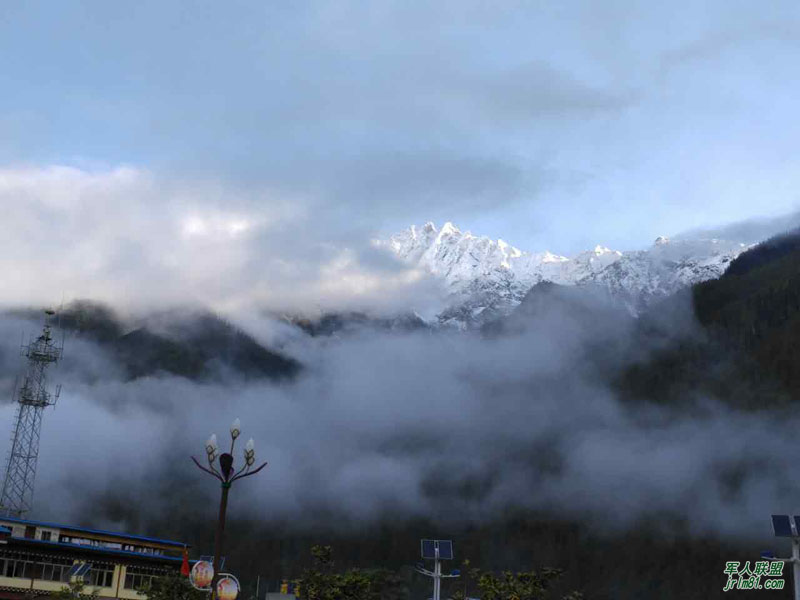 在亚丁看到雪山无比兴奋,等到了波密,大早推开宾馆的窗户,面对的就是雪山、林海。但是刚刚看到点山尖,就被雨云全部覆盖了。有朋友提醒,在波密,七点钟前可以看到彤云映照雪顶,金顶红霞,但我们面对的是浓云翻滚。不过,在八点要离开宾馆前,突然云开雾散,瞬间,雪山展开了她的完美笑颜。波密,就是一个被雪山森林包围着的河谷小城。波密的早晨太美了,美得令人窒息,如若人间仙境……