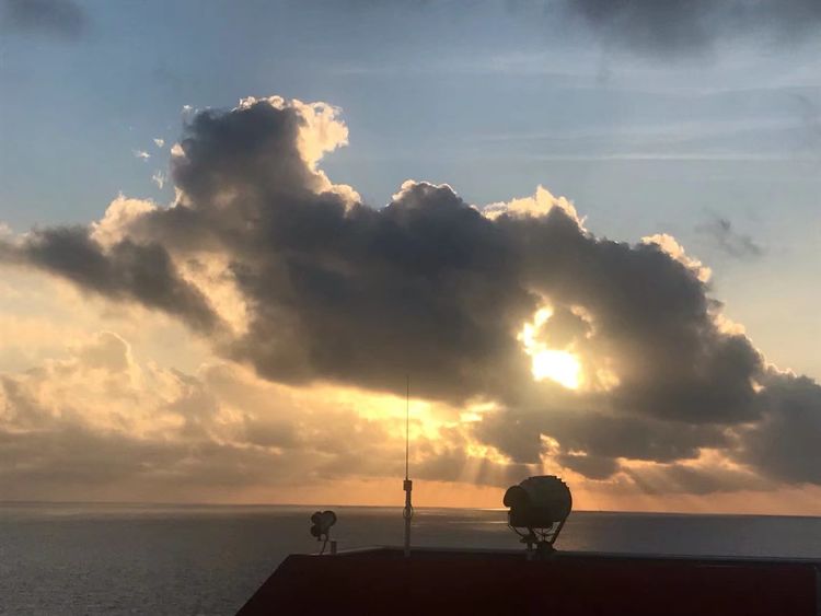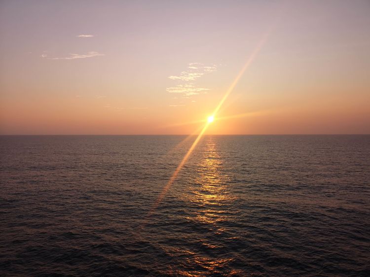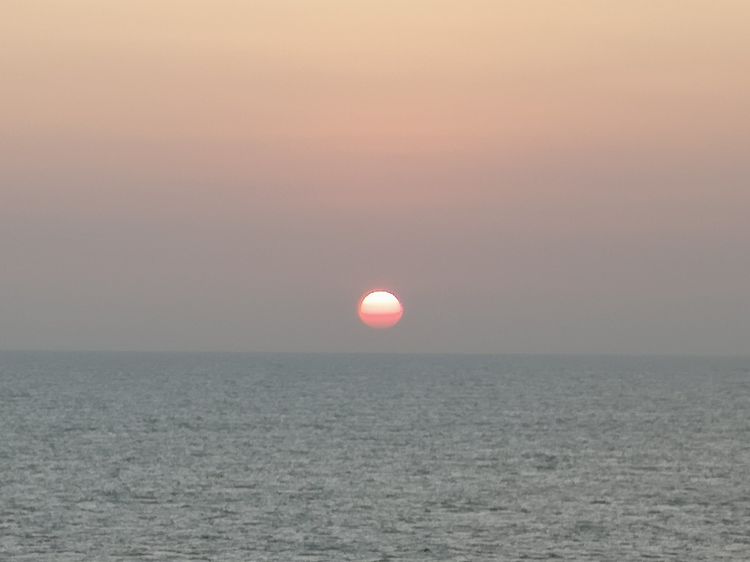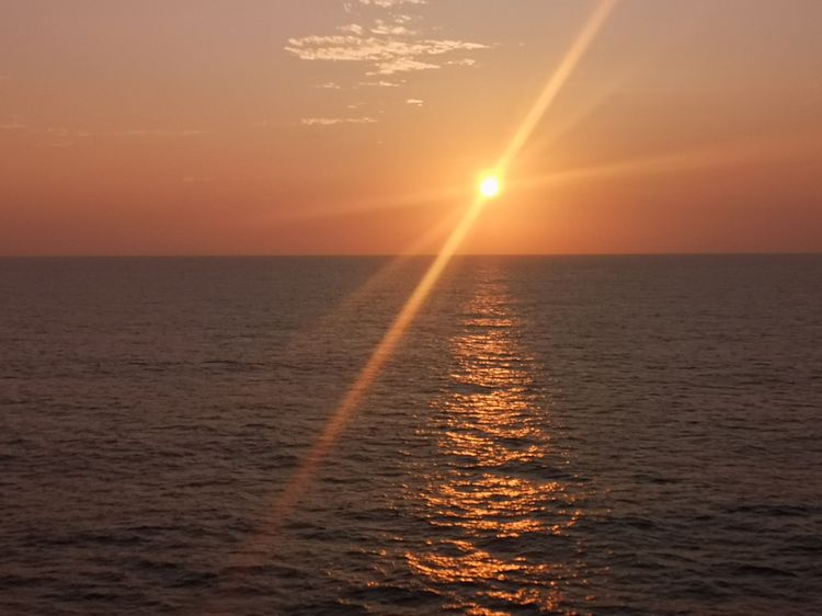 次日清晨,我被拍摄海上日出的念头唤醒,急匆匆背上相机包踏着楼梯来到顶层甲板。邮轮早已到达了预定位置并抛锚,但海面上还是一片漆黑,只有海风静静地吹和海浪轻轻地摇。虽然这里早晨气温并不很低,但海风长时间吹拂会迅速带走人体热量,必须穿上长袖外套。