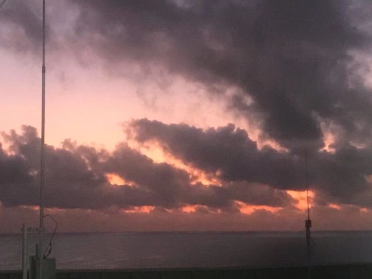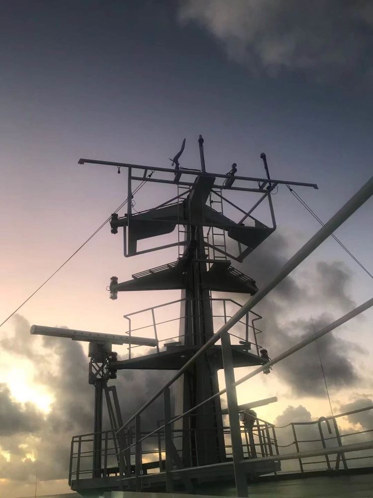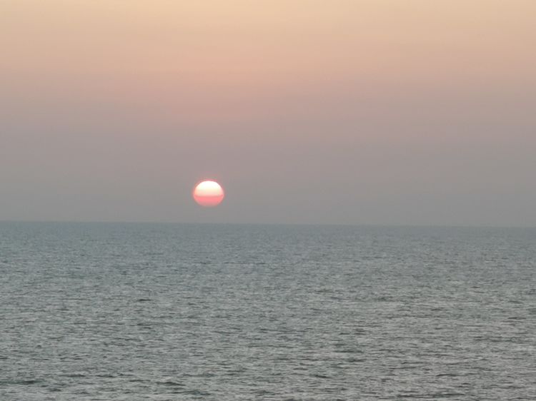 半个小时后,天空似乎慢慢苏醒,远方的云层逐渐有了血色,甲板上的人也越来越多。能在西沙群岛看日出是难得的机遇,没有人愿意错过。厚厚的云层似乎正在被晨风撕碎,阳光在努力寻找到缝隙喷薄而出,终于将整个东方披满了霞光。到表定的7点零6分日出时刻天已大亮,云层已变得越来越稀薄,湛蓝色调渐渐占据了天空的主页。