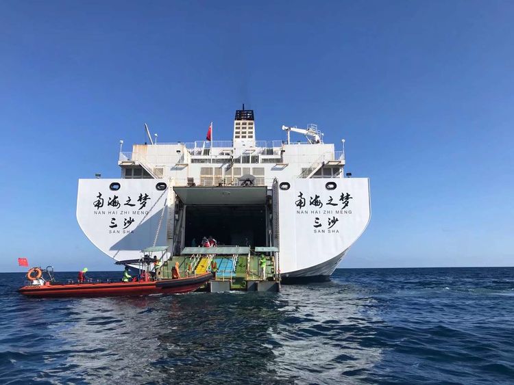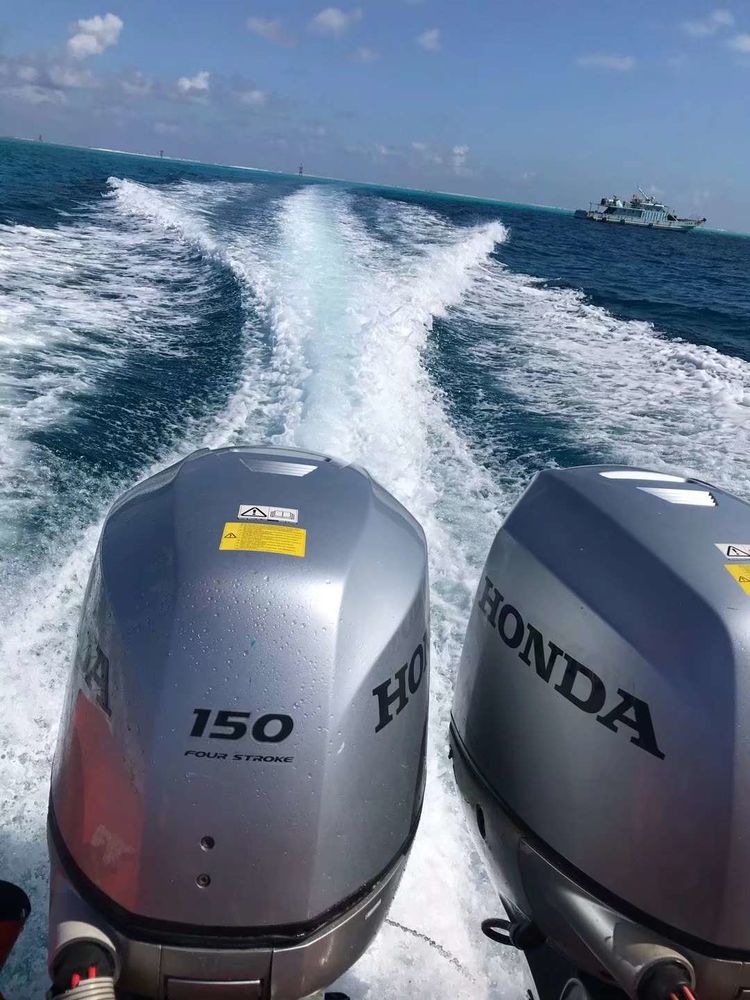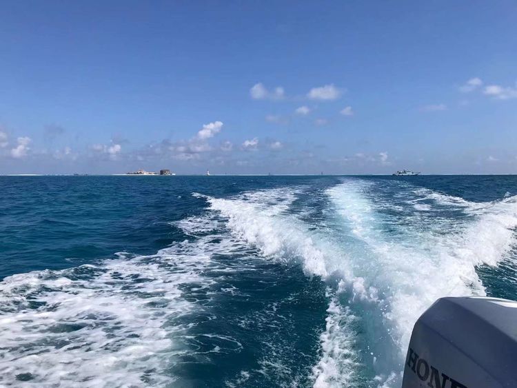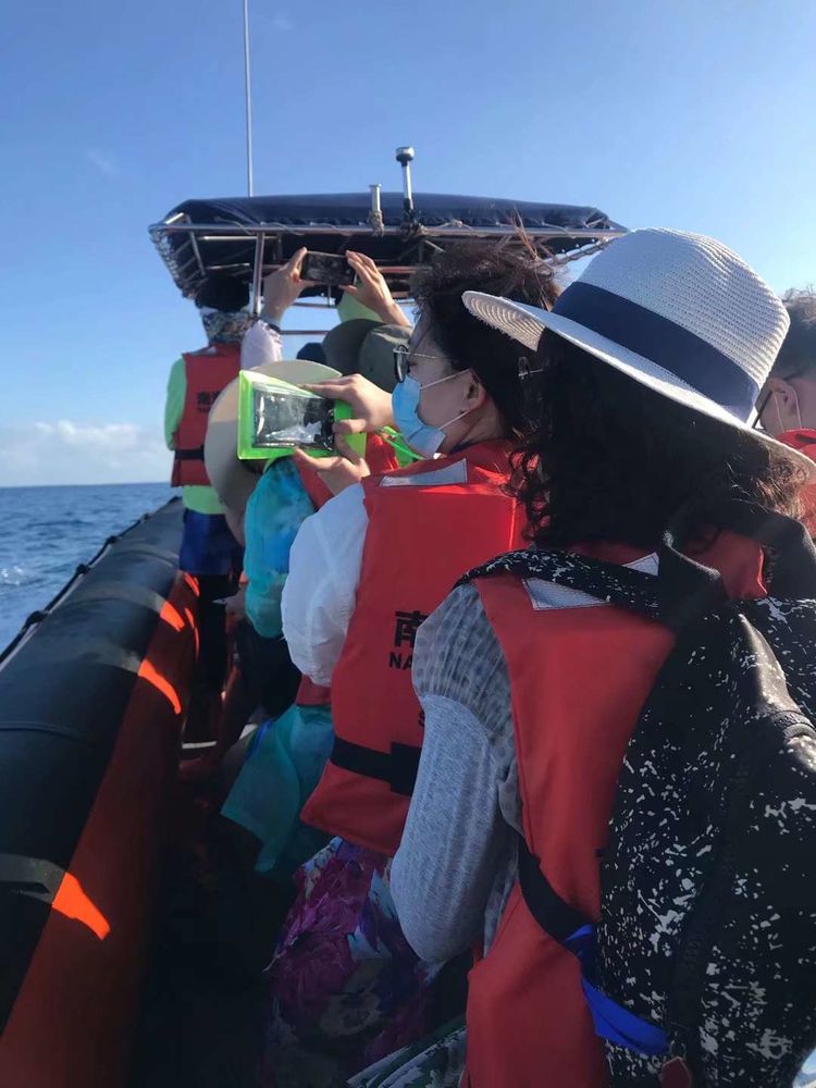 停泊在面前的是两侧带有浮筒的橡皮冲锋艇,艇后部的日本雅马哈发动机在阳光下骄傲地昂着头。在工作人员的帮扶下我们跨骑在呈纵向排列的坐位上。这种冲锋艇每次能载运14个人。离开母船后立即在海面上飞驰,船艏几乎离开水面。斜着吹来的海风将溅起的水花无情地甩在左排人们的脸上,半面身体无处躲避倒也痛快淋漓。十几分钟以后快艇已到达前方的小岛,这将是普通国人以旅行方式能够到达的祖国领土最南端。