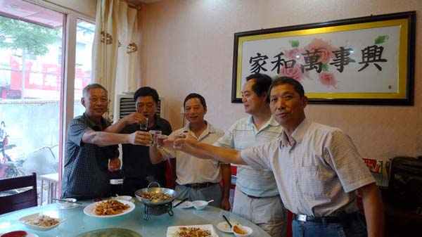 如果从21日早5点到淮南算起,到22日20时离开徐州,从皖北到苏北,碾转两个省、五个地级市,活动时间总共还不到40个小时。在这30多个小时里,喝了四场酒,先后见到寿县的黄圣才、蚌埠的周殿军、侯海燕、四方湖、铁牛,韩福永、小陈、萧县的李茂祥、侯金华、浙江上虞的徐孝根,武义的沈孙兴、钟法品、江苏常州的马立昆仑,徐州的王家勇,一共是14个人。并且在席间或路上,先后与淮安的徐德彪、亳州的王伟(原75师电影队放映员)、淮北的郭宜中(原75师宣传科副科长-现淮北政协文史委主任)通了电话。想见的绝大部分都见到了,而且超出原计划。但是,唯一的一个遗憾是,糊涂老兄正好在我们去蚌埠那天动手术。他不能到酒场,我们也不能去探视。只好委托海燕代为问候。