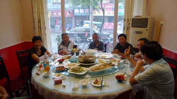 在我的执意坚持下,我们一行四人于下午3点45分告别黄圣才夫妇、告别千年古城--寿县。由黄圣才的大公子开车送我们去淮南汽车站,随即上了一班车向蚌埠赶。上车后,临时决定,在蚌埠吃顿晚饭,然后北上。既然在蚌埠吃饭,就有了见蚌埠战友的机会,考虑到海燕与糊涂都有事,就给原75师电影队的韩福永打了个电话。让他在火车站附近安排个地方,约几个当地战友吃顿饭,见个面。