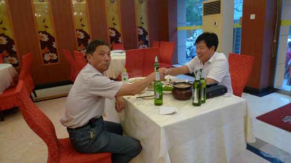 在徐州,我与四位江浙战友告别后,在市内办了点事情。买了一张晚上8点的K235次无座票,看看时间才5点半,还有两个半小时。随即与原12军装甲兵2师后勤部副部长--现转业在徐州台办的王家勇通了个电话,6点钟他赶到车站。我们就在徐州饭店找了个地方,要了几道淮扬菜,每人2瓶啤酒。边喝边聊天,看看到了7点半,依依不舍的与家勇道别,转身进了候车室。