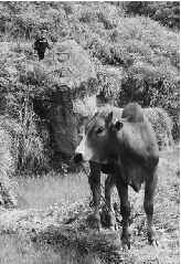 梯田的更深处的一个坟冢的旁边,有一面比黑板还大的石头。从正面的角度看,它与普通石头无异,但攀爬到石头的顶端或是侧蹲在石头的一旁,却可以看到清晰的凹凸痕图像——一边像弯月,一边则像太阳。从整体看,又像是面朝仙华山神女峰的一个牛图腾。村里人将这块石头叫做“金牛石”。