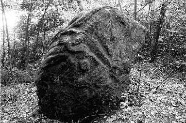 在阴湿的山林间穿行了近一个半小时后,眼前才豁然开朗——一块两米高的蛋形巨石横卧在面前。在雨水的浸润下,油亮石头上痕迹清晰。“就是它!”找到石头的兴奋将我们行走的疲惫一扫而空。