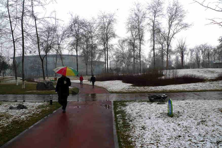 今天的雪,其实下的并不大。早饭后,雪花已经变成了雪糁,落到地上就化成了水。因为下着雪,气温在2、3度的样子,应该算比较冷。所以,街上的行人要比平时少些。云起出的家门来到石家庄最繁华的中山路上,一路西行大约1公里的样子就来到石家庄市区内最大的公园--长安公园。