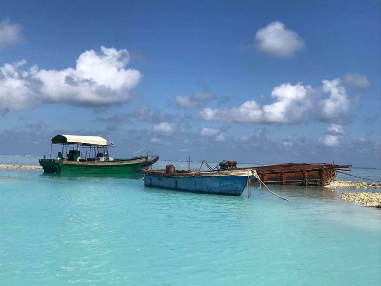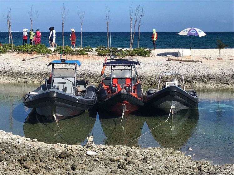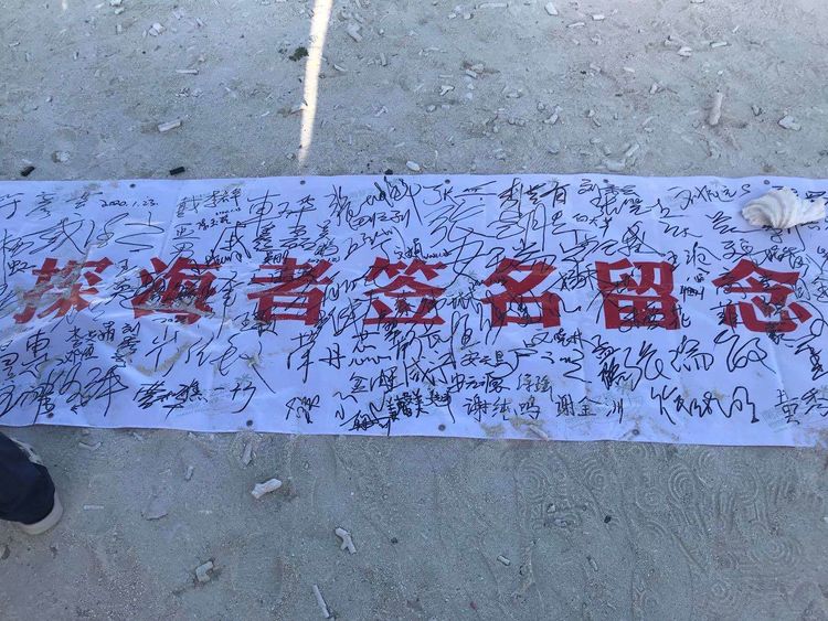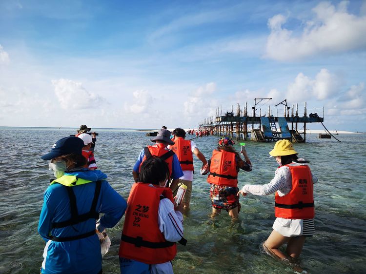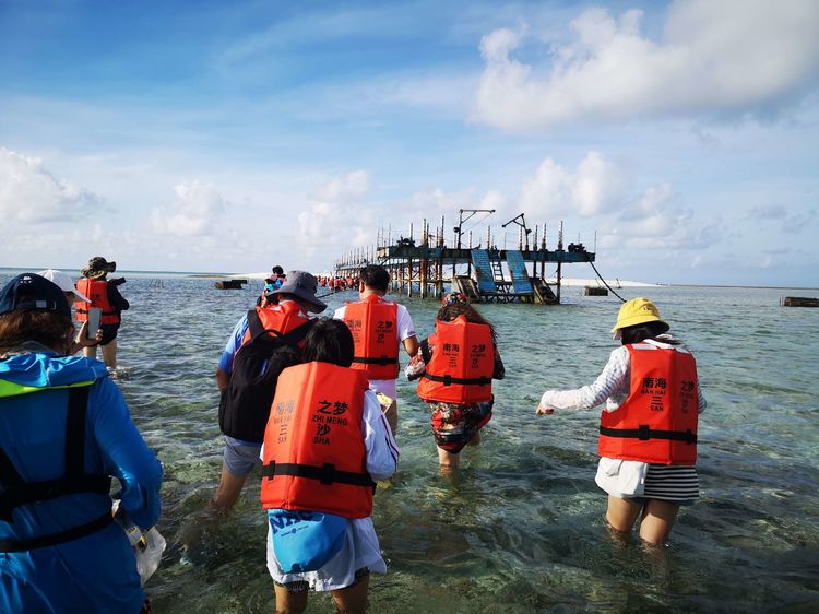 “全富岛”是三个小岛中最美的,面积为0.02平方公里,相对来说也是三个小岛中最大的。上岛时正值退潮,小岛近处的珊瑚礁已在水下显露出阴森的颜色。水浅导致载人冲锋艇无法靠岸,只好让大家挽起裢腿涉水上岛。水中礁石大小不一,坑坑洼洼,我们脚上穿着便于涉水的洞洞鞋可明显感觉到珊瑚礁石边缘的坚硬与锋利。清澈的海水已淹到大腿跟,水中还有如墨水瓶盖大小半透明的水母在飘荡,管家边走边焦急地招呼:“抓紧上岸,小心水母”。艰难走到岸上时鞋里已灌满了沙子。管家庆幸地说:“这次还算好,有一次下船涉水时水深到胸,上到岸上几乎全身湿透。”