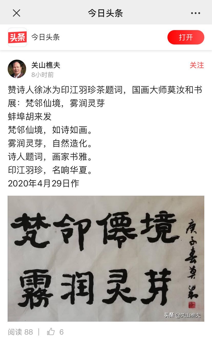 转胡来发赞关山樵夫为印江羽珍茶题词 Post By:2020/4/30 8:52:27