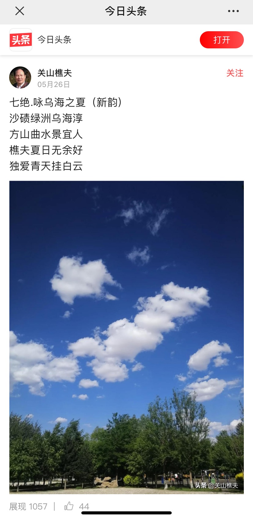 共有18055人关注过本帖树形打印主题:关山樵夫七绝:咏乌海之夏(新韵) |
