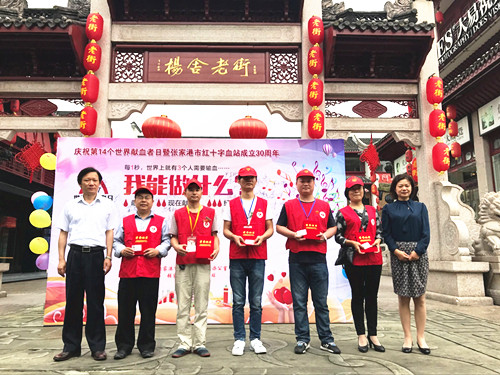 2017年6月13日上午,由张家港市献血办、张家港市红十字血站主办的2017年世界献血者日暨血站成立三十周年庆祝活动在张家港市杨舍老街隆重举行。市卫计委主任/市献血办主任/市红会常务副会长王卫国、市卫计委党委委员/市红会副会长蔡贤、市红十字血站站长李浩出席庆祝活动,并为获得“2014—2015年度国家无偿献血奉献奖”献血者代表颁发获奖证书和赠送“无偿献血爱心卡”。无偿献血服务队志愿者、获奖献血者代表、医务人员代表共80多人出席庆祝仪式。